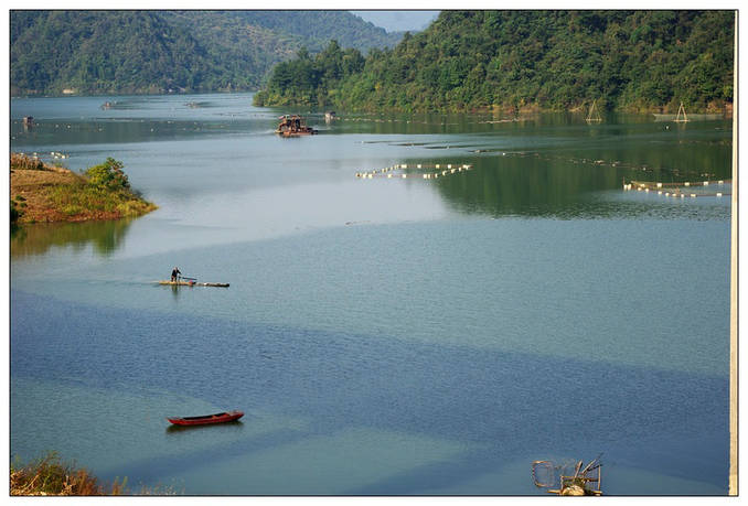 不知過(guò)了多久!也不知穿過(guò)了多少座隧道!我依然沉浸在遠(yuǎn)離凡塵喧囂的鬧市、相伴于群山峻嶺,四季如春綠油油松柏夾雜著少許紅楓秋葉的幻想之中,間或在轉(zhuǎn)瞬即逝日薄西山的余暉照映下熠熠生輝!此時(shí)此刻的我已經(jīng)是到了忘我的最高境界,腦中忽然閃過(guò)歐陽(yáng)老翁的一句至理名言——【醉翁之意不在酒,而在乎山水之間!】這句話用在此處真的是妙不可言!我那萬(wàn)千思緒隨著飛馳的車(chē)輪早已飄到九霄云外,暗自為窗外如畫(huà)如詩(shī)的景象所迷惑、所陶醉、所依戀...!猛然間聽(tīng)到一句非常熟悉且溫暖的話——爸爸!快看!到了磨子潭風(fēng)景觀賞區(qū)了!我才恍然如夢(mèng)驚醒,朝遠(yuǎn)處向下望去好一個(gè)一望無(wú)際的“磨子潭”!其潭水清澈,魚(yú)影可現(xiàn);微風(fēng)襲來(lái),碧波蕩漾;譚中游筏,漁歌互答;這時(shí)女兒也詩(shī)意助興了!滿懷深情地吟誦——“磨子潭水-深千尺,不及‘爸媽’-送我情!”這句真是太絕了!女兒漸漸地長(zhǎng)大了,懂得感恩戴德了。車(chē)子終于快要鉆進(jìn)最后一個(gè)隧道了,我也不知道它是排第幾?感覺(jué)今天好像是專(zhuān)乘“高速隧道”之旅了?!在快要進(jìn)入末了隧道的一霎那,我還特留戀地回頭朝窗外俯視一下,只見(jiàn)磨子潭中那無(wú)數(shù)的‘網(wǎng)箱’把整個(gè)潭水劃分成大小不等的方塊,好像一張碩大無(wú)比殘缺不全的圍棋盤(pán)面撒在幽深的譚中,我還來(lái)不及細(xì)數(shù)就立刻消失在我難以忘卻的視線中.....!